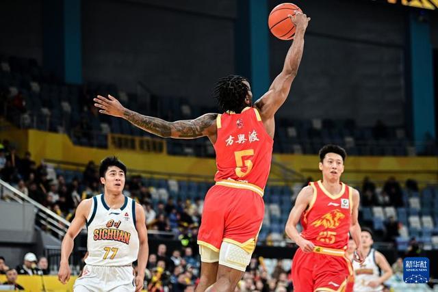 1月15日,四川丰谷酒业队球员加克(上)在比赛中扣篮。新华社记者 江汉 摄